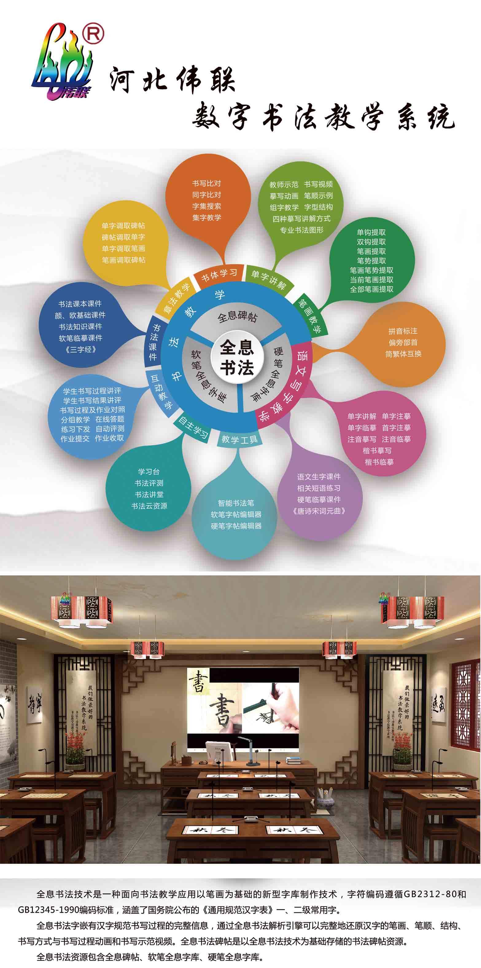 河北偉聯(lián)教學(xué)儀器設(shè)備有限公司開拓的數(shù)字化書法教室,涵蓋了全息書法下的“全息碑貼”、“硬筆全息字庫”、“軟筆全息字庫”,以“書法教學(xué)”和“語文寫字教學(xué)”為基礎(chǔ),字符編碼遵循GB2312-80和GB12345-1990編碼標(biāo)準(zhǔn),通過全息書法解析引擎可以完整地還原漢字的筆畫、筆順、結(jié)構(gòu)、書寫方式與書寫過程動(dòng)畫和書寫示范視頻。