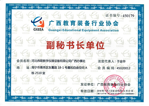 2018年1月18日,河北偉聯(lián)教學(xué)儀器設(shè)備有限公司廣西辦事處正式入會廣西教育裝備行業(yè)協(xié)會,并榮獲《廣西教育裝備行業(yè)協(xié)會副秘書長單位》證書。